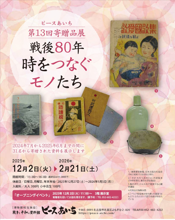 第13回 寄贈品展「戦後80年 時をつなぐモノたち」が12月2日(火)から開催されます。今回は2024年7月から2025年6月までに寄贈された158点を寄贈者別に展示します。