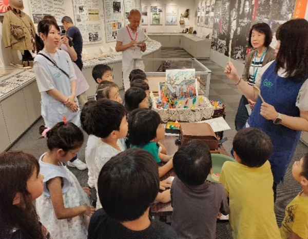 毎年7月になると、法人の運営する保育園の5歳児皆で、ピースあいちさんを訪問しています。3歳から「平和」ってなんだろう?と考える機会を設け、継続的に取り組みをおこなっています。年長児は事前学習としてスタジオジブリの名作「火垂るの墓」を鑑賞し、それぞれの感想を話し合います。