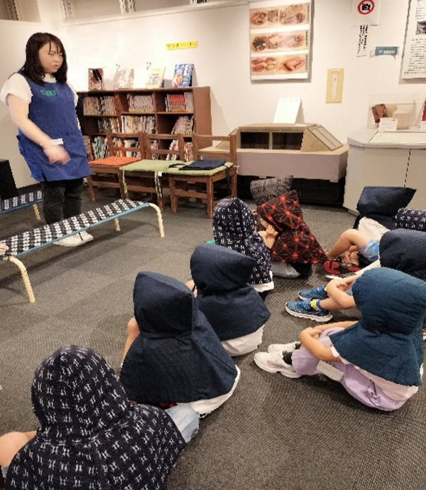 その後、ピースあいちさんを訪問します。映画の中で節子が被っていた防空頭巾を実際に被り、町を焼き尽くした焼夷弾を触ることは、子どもたちにとって「少し怖い、でも興味がある」体験になります。その体験を通し、映画の中の出来事が現実であったのだと、子どもたちは初めて感じるのです。