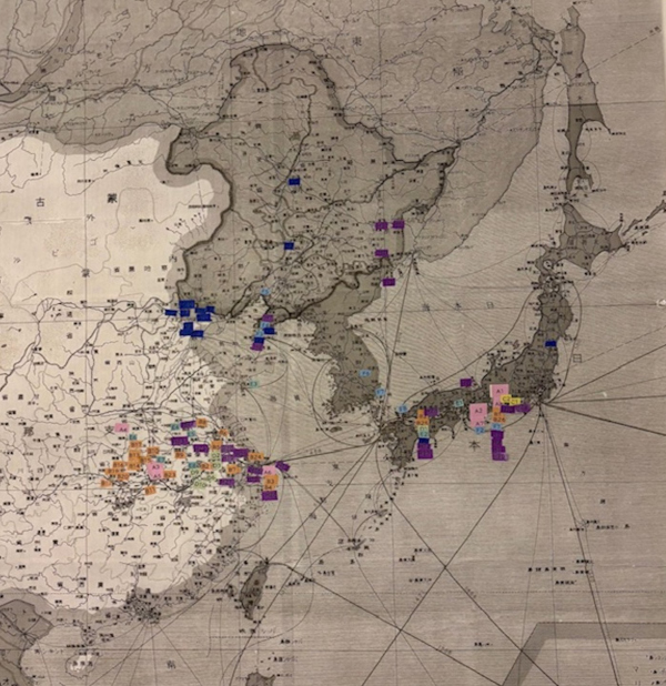展示では、このような手帳を通して9名の兵士が歩んだ戦争の道のりをたどりました。寄贈された手帳から軍歴を読み解き、その足取りを地図上に可視化しています。名古屋周辺の連隊区から徴兵された兵士が多かったため、足跡は華中方面に集中しています。しかし、同じ地域へ向かったとしても、歩んだ道はひとりひとり異なります。戦死した兵士の足跡は途中で途切れ、生還した兵士の記録は帰還後の生活へと続いていきます。地図上の印をたどると、戦場を生きた兵士のそれぞれの歩みが浮かび上がってきます。