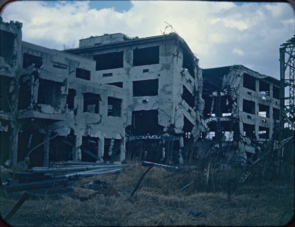 ・・・大地の震動が止み、豪の外へ出るとあたりは砂塵が荒れ狂い、黒煙のなかを何百人の工員や学徒が、悲鳴をあげながら逃げまどっている。地面には木材やコンクリートの残骸、鉄筋四階建ての研究館はぽっかり穴があき、窓ガラスは全部吹っ飛んでいる。