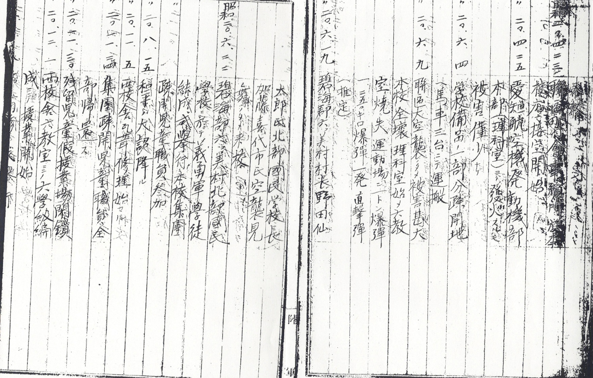 「聨區(れんく) 大空襲ノタメ被害甚大 本校全壊 理科室始メ六教室焼失 運動場ニ 一トン爆弾(実際には二トン爆弾だったがこれまで使用された例がなかったため一トン爆弾と記載されている?)、二五0キロ爆弾一発直撃弾〈推定〉」